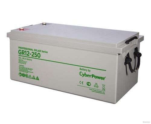 Аккумулятор CyberPower GR 12-250 (ёмкость 274 Ач, напряжение 12 В) разработан с применением технологии GEL — электролит загущен до желеобразного состояния, что существенно повышает устойчивость к глубоким разрядам и температурную стабильность. Корпус батареи выполнен из прочного ABS пластика и надёжно герметизирован, обслуживание на протяжении всего периода эксплуатации (15 лет) не требуется. GR 12-250 применяется в системах солнечной и ветрогенерации, автономных системах энергоснабжения, источниках бесперебойного питания и других областях.