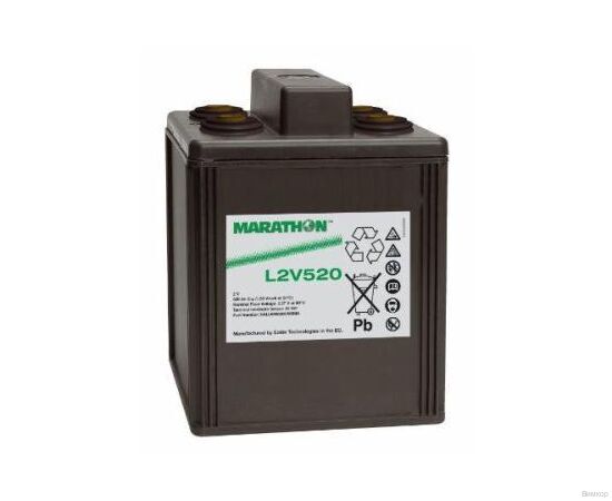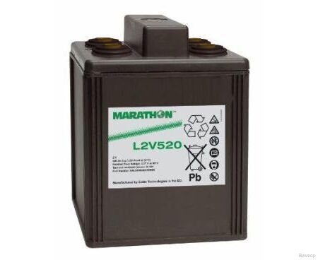 Аккумулятор Marathon L2V520 обладает характеристиками 520 Ач, 2 В и предназначен для работы в буферном режиме, но может использоваться и в циклическом. Надёжный корпус из неокисляемого пластика полностью герметичен и имеет на своей крышке клапан избыточного давления. Сам аккумулятор является необслуживаемым, а значит на протяжении всего периода эксплуатации доливать воду не требуется. Технология AGM (сепараторы из стекловолокна) позволяет удерживать электролит неподвижно. При соблюдении температурного режима (20 °C) срок службы батареи может достигать 12 лет. Аккумуляторная батарея Marathon L2V520 имеет усовершенствованную конструкцию легированных кальцием электродов из особо чистого свинца, что обеспечивает продолжительный срок службы и улучшенные разрядные характеристики.