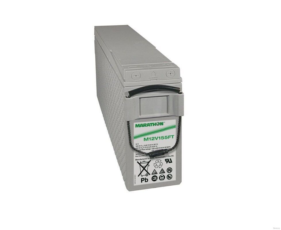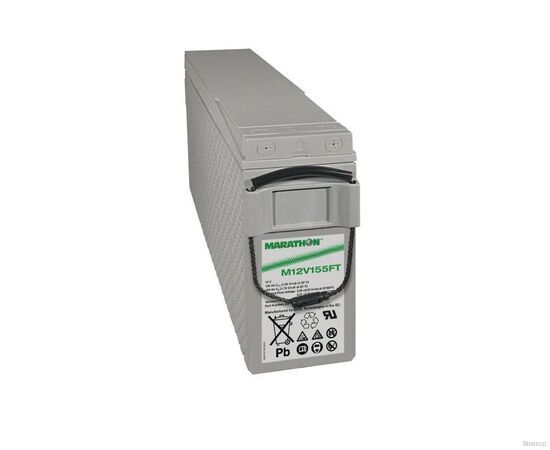 Фронт-терминальный аккумулятор Marathon M12V155FT спроектирован для установки в специальные стойки и стеллажи, а также обладает высокой плотностью энергии (150 Ач; 12 В). Батарея может использоваться в циклическом и буферном режимах. При соблюдении правил эксплуатации срок службы может достигать 12 лет. Материал корпуса — долговечный пластик, на крышке расположен клапан избыточного давления. Фронт-терминальное расположение клемм заметно упрощает и удешевляет обслуживание. Технология AGM позволяет удерживать жидкий электролит неподвижно. Аккумуляторная батарея Marathon M12V155FT имеет усовершенствованную конструкцию легированных кальцием электродов из особо чистого свинца, что обеспечивает продолжительный срок службы и улучшенные разрядные характеристики.