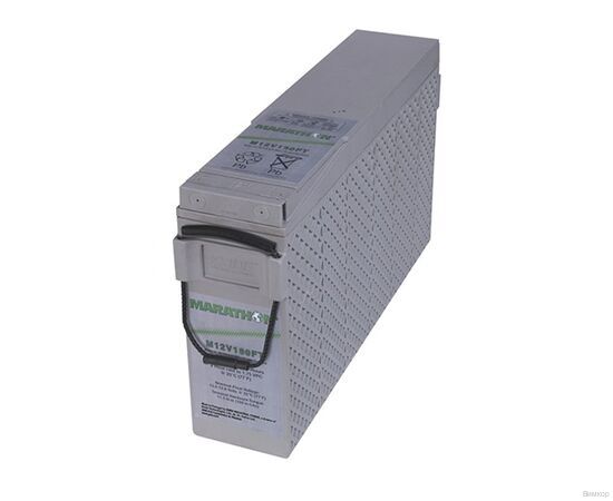 Фронт-терминальный аккумулятор Marathon M12V190FT спроектирован для установки в специальные стойки и стеллажи, а также обладает высокой плотностью энергии (190 Ач; 12 В). Батарея может использоваться в циклическом и буферном режимах. При соблюдении правил эксплуатации срок службы может достигать 12 лет. Материал корпуса — долговечный пластик, на крышке расположен клапан избыточного давления. Фронт-терминальное расположение клемм заметно упрощает и удешевляет обслуживание. Технология AGM позволяет удерживать жидкий электролит неподвижно. Дата производства аккумулятора Marathon M12V190FT указана на крышке в виде символьного кода. Аккумуляторная батарея Marathon M12V190FT имеет усовершенствованную конструкцию легированных кальцием электродов из особо чистого свинца, что обеспечивает продолжительный срок службы и улучшенные разрядные характеристики.