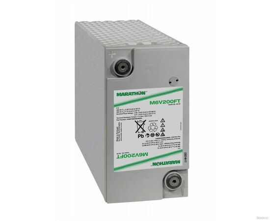 Фронт-терминальный аккумулятор Marathon M6V200FT спроектирован для установки в специальные стойки и стеллажи, а также обладает высокой плотностью энергии (200 Ач; 6 В). Батарея может использоваться в циклическом и буферном режимах. При соблюдении правил эксплуатации срок службы может достигать 12 лет. Материал корпуса — долговечный пластик, на крышке расположен клапан избыточного давления. Фронт-терминальное расположение клемм заметно упрощает и удешевляет обслуживание. Технология AGM позволяет удерживать жидкий электролит неподвижно. Аккумуляторная батарея Marathon M6V200FT имеет усовершенствованную конструкцию легированных кальцием электродов из особо чистого свинца, что обеспечивает продолжительный срок службы и улучшенные разрядные характеристики.