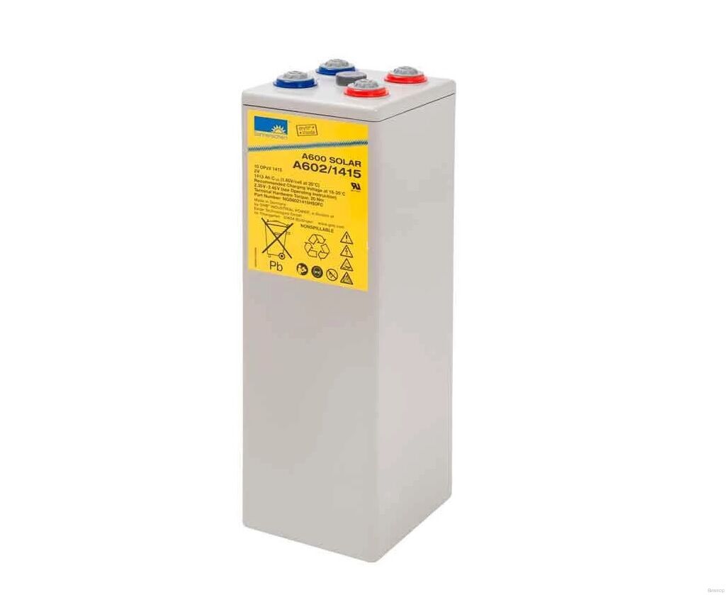 Свинцово-кислотный аккумулятор Sonnenschein A602/1415 SOLAR (ёмкость 1408 Ач, напряжение 2 В) разработан для преобразования солнечной энергии, он также используется для небольших систем автономного электроснабжения, телекоммуникациях, источниках бесперебойного питания, нефтегазовой промышленности. Циклический ресурс составляет 800 циклов заряд-разряд. Корпус выполнен из прочного ABS-пластика и надёжно герметизирован. Внутри Sonnenschein A602/1415 SOLAR поддерживается давление, необходимое для рекомбинации газов, благодаря этому обслуживание батареи не требуется. Электролит находится в желеобразном состоянии (технология Dryfit), это повышает устойчивость аккумулятора к воздействию температур и глубоких разрядов. Дата производства аккумулятора Sonnenschein A602/1415 SOLAR указана на крышке в виде символьного кода.