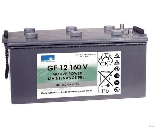 Тяговый аккумулятор Sonnenschein GF 12 160 V (ёмкость C5 160 Ач, напряжение 12 вольт) разработан с применением технологии GEL (или Dryfit — электролит загущен до желеобразного состояния), что обеспечивает повышенную устойчивость к температурам и глубоким разрядам. Он применяется в электромоторах с высокими требованиями к энергоёмкости, циклической выносливости и мобильности: яхты, лодки, инвалидные коляски, уборочная и складская техника. Батарея не требует обслуживания (долива воды) и отдельного помещения для зарядки. Главное отличие Sonnenschein GF 12 160 V от других тяговых аккумуляторов — повышенная безопасность. За это отвечает сверхпрочна конструкция корпуса из ABS пластика, отдельное внимание уделено искробезопасности. Дата производства аккумулятора Sonnenschein GF 12 160 V указана на крышке в виде символьного кода.