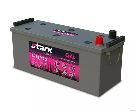 Свинцово-кислотный необслуживаемый гелевый аккумулятор Stark S712/120 напряжением 12 В ёмкостью 127 Ач изготовлен по технологии PURE GEL TECH. Раствор серной кислоты, смешанный с пирогенным диоксидом кремния, представляет из себя желеобразную массу — такое состояние электролита положительно сказывается на сроке эксплуатации: до 15 лет в буферном режиме и не менее 1200 циклов в циклическом. Герметичный корпус батареи выполнен из высокопрочного полимера, устойчивого к деформации. Аккумулятор можно эксплуатирова в вертикальном и горизонтальном положении. На крышке предусмотрены VRLA-клапаны, индивидуальный для каждой ячейки. Stark S712/120 надёжно герметизирован, обслуживать свинцово-кислотный аккумулятор не требуется.