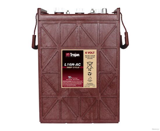 Аккумулятор Trojan L16H-AC - это тяговая АКБ моноблочного типа с жидким электролитом. Состоит из трех ячеек напряжением по два вольта, соединенных внутри корпуса последовательно. Общее рабочее напряжение 6 вольт. Тип пластин - намазные. Особенностью является технология T2 TECHNOLOGY™, разработанная компанией Trojan, которая и обеспечивает максимальную производительность и срок службы. В технологию входит и специальная конструкция корпуса, позволяющая электролиту свободно циркулировать внутри, обеспечивая равномерность плотности по всей площади пластин. АКБ L16H-AC является обслуживаемым, контроль уровня электролита и долив воды входит в еженедельный регламент.