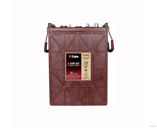 Тяговый аккумулятор Trojan L16P-AC (напряжение 6 В, ёмкость C5 344 Ач) с жидким электролитом применяется для подъёмно-тяговой, поломоечной, грузовой техники и других электродвигателей. Прочный корпус надёжно защищает батарею от протекания электролита. Trojan L16P-AC устойчив к глубоким разрядам и работает в широком диапазоне температур. Аккумулятор обслуживаемый, а значит необходимо проверять уровень воды и доливать её при необходимости. Это повышает срок службы и количество циклов заряда-разряда. Дата производства аккумулятора Trojan L16P-AC указана на крышке в виде символьного кода.