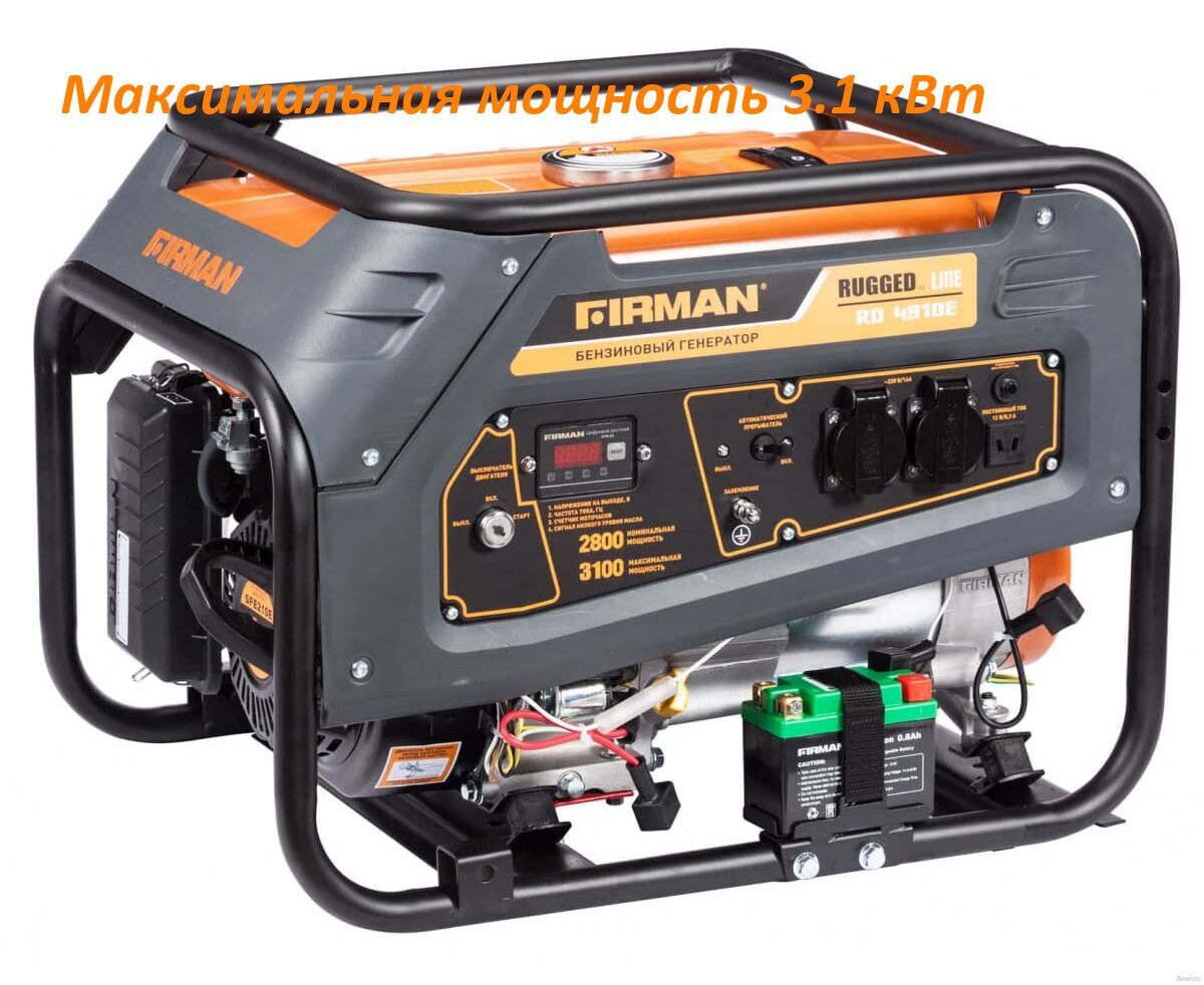 - Отличительная черта: Бензиновый однофазный электрогенератор Firman RD4910E номинальной мощностью 2,8 и максимальной мощностью 3,1 кВт.