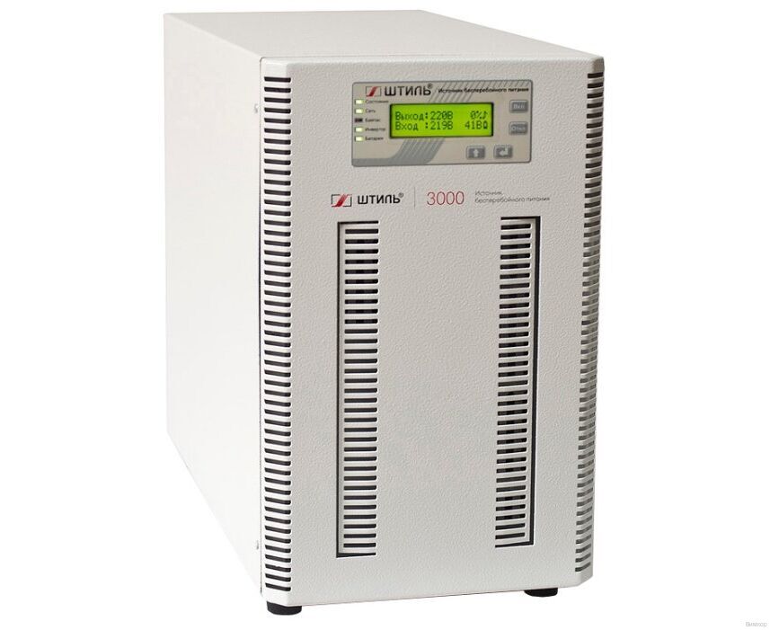 - Техническая спецификация: ИБП Штиль ST1103SL с двойным преобразованием, 3000 ВА / 2700 Вт, выходные разъемы: IEC-320-C13 (3 шт.), IEC-320-C19 (1 шт.), EURO розетка (2 шт.), время автономной работы от встроенных АБ при 100 % нагрузке - 6 мин, интерфейсы для мониторинга в базовой комплектации: RS-232, "сухие" контакты (3 шт.).