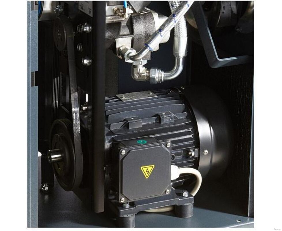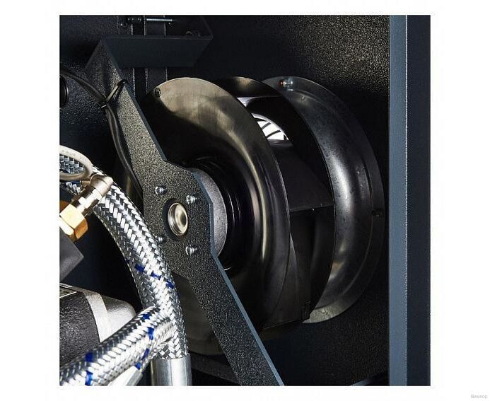 - Конструктивный плюс: Применение центробежного малошумного и надежного вентилятора, специальных шумозащитных панелей внутри компрессора и установке электродвигателя и винтового блока на виброопорах позволяет добиваться уровня шума ниже конкурентов на ~ 7дБ.