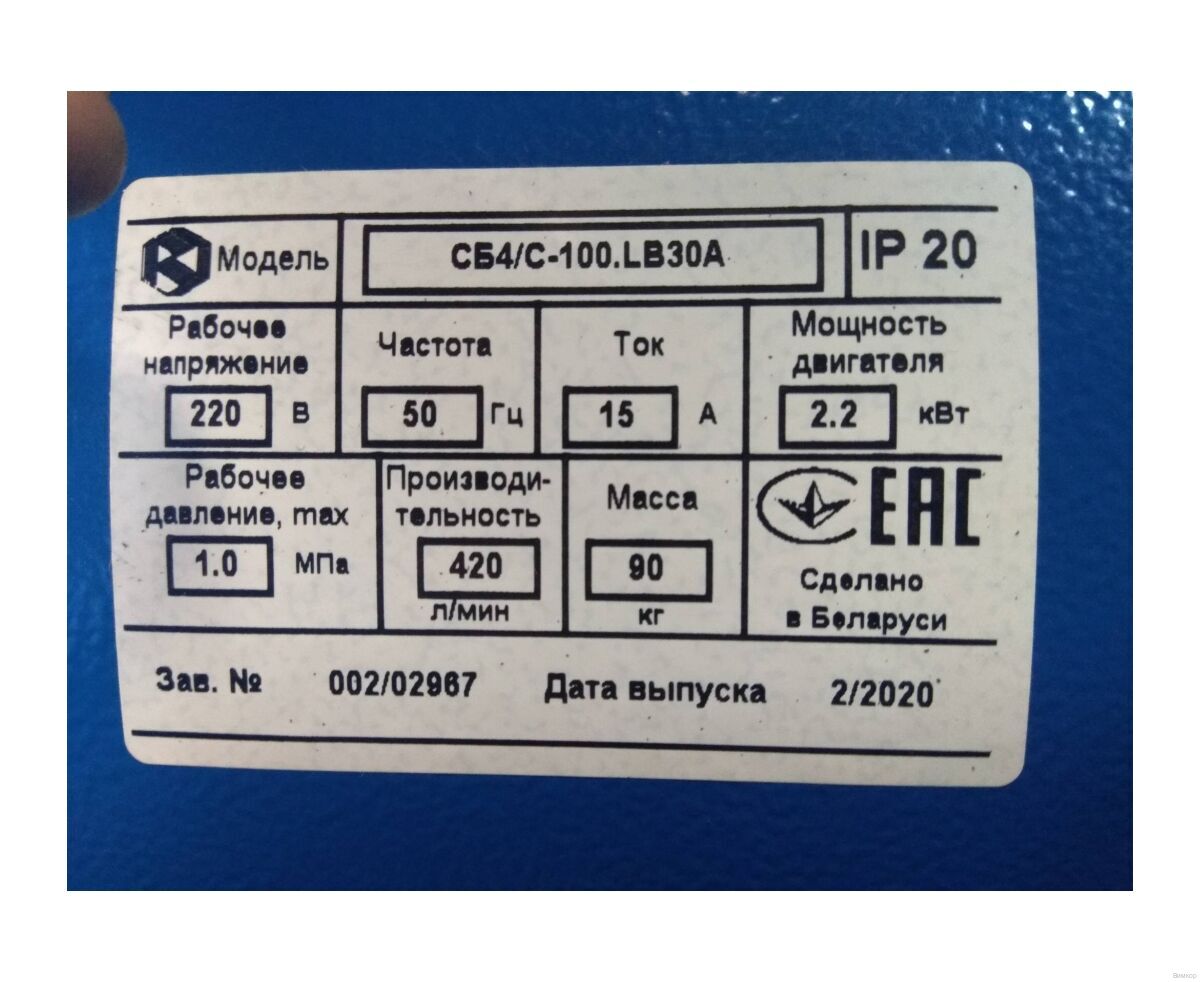 Характеристики Компрессор Remeza СБ 4/С-100 LB 30 A (21688)