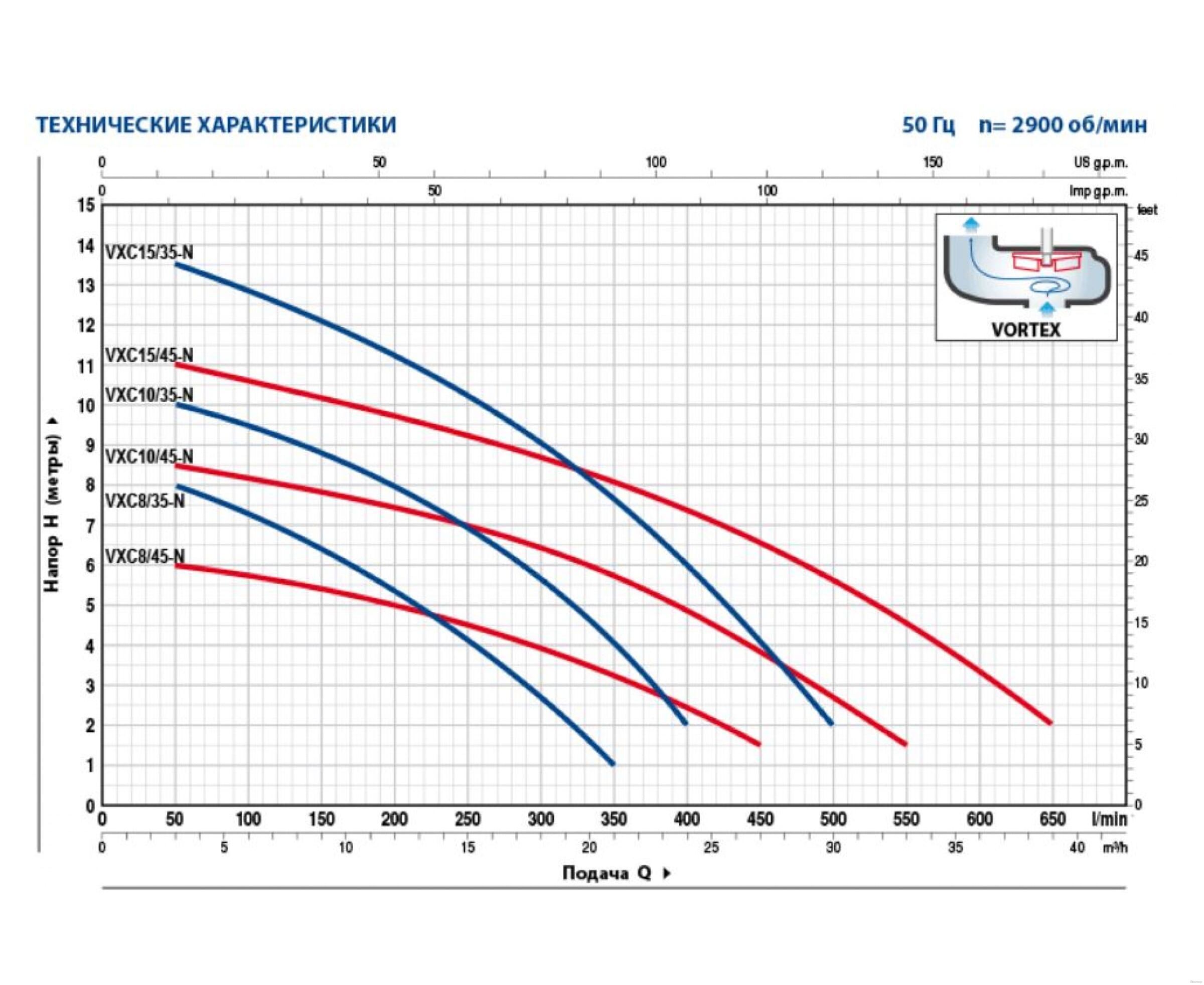 - Отличительная черта: Ключевые характеристики: Эксплуатационные ограничения: глубина погружения до 10 м; максимальная температура жидкости до +40 °C; прохождение твердых взвешенных частиц – до 40 мм для моделей VXC /35-N, до 50 мм для моделей VXC /45-N; минимальная глубина погружения для продолжительного режима работы – 280 мм для VXC /35-N, 300 мм для VXC /45-N.