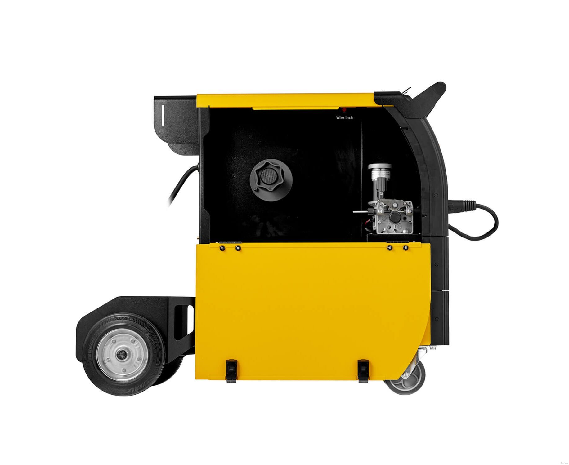 - Значимый факт: Возможно установить катушку с проволокой весом до 18 кг (D300) и регулировать скорость подачи проволоки от 2 до 13 м/мин; наличие кнопки прогона проволоки без газа; на задней панели аппарата размещена розетка для подогревателя газа на 36 В; функция автоматической защиты от перегрева; сборная платформа для перемещения газового баллона и съёмная боковая полка для сварочной горелки и ЗИП.