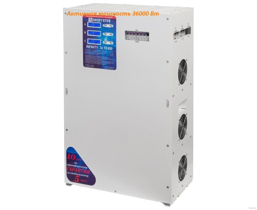 - Инженерная особенность: Трехфазный стабилизатор Энерготех INFINITY 15000х3 полностью автономен и не нуждается в вашем контроле и обслуживании, не имеет реле, сервопривода и других механических деталей, подверженных износу.
