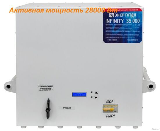 - Отличительная черта: Стабилизатор INFINITY 35000 разработан для подключения однофазных потребителей мощность которых не превышает 35000 ВА (28000 Вт) и точность стабилизации на выходе составляет ±4.3%.