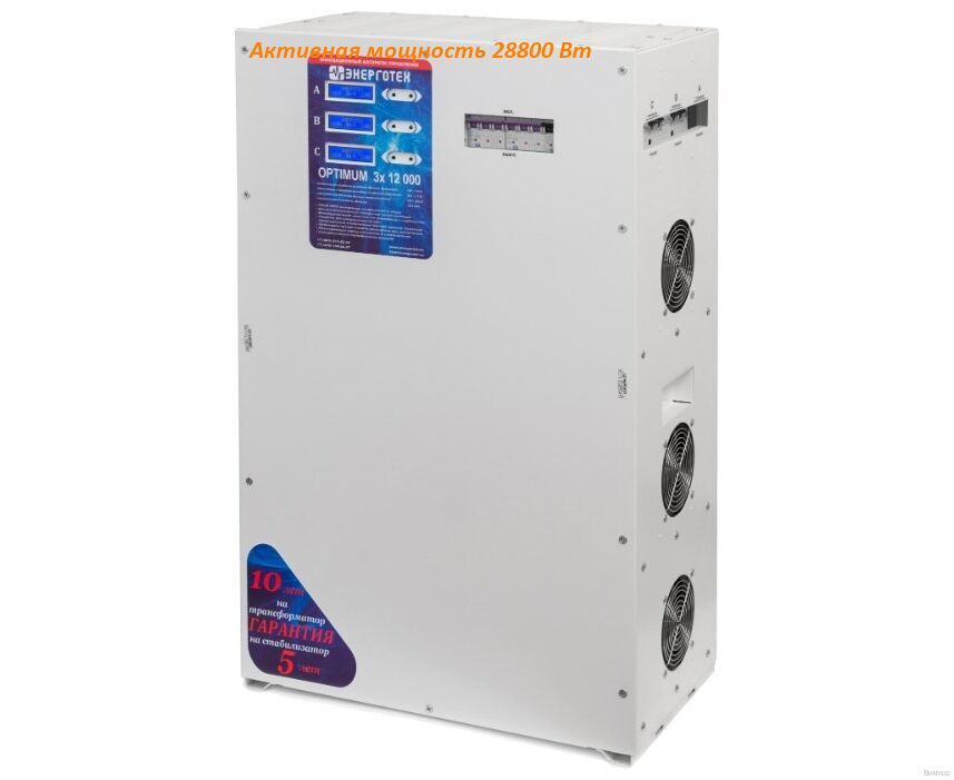 - Важная деталь: Трехфазный стабилизатор Энерготех OPTIMUM+ 12000х3 автономен, не нуждается в обслуживании, не имеет реле, сервопривода и других механических деталей, подверженных износу.