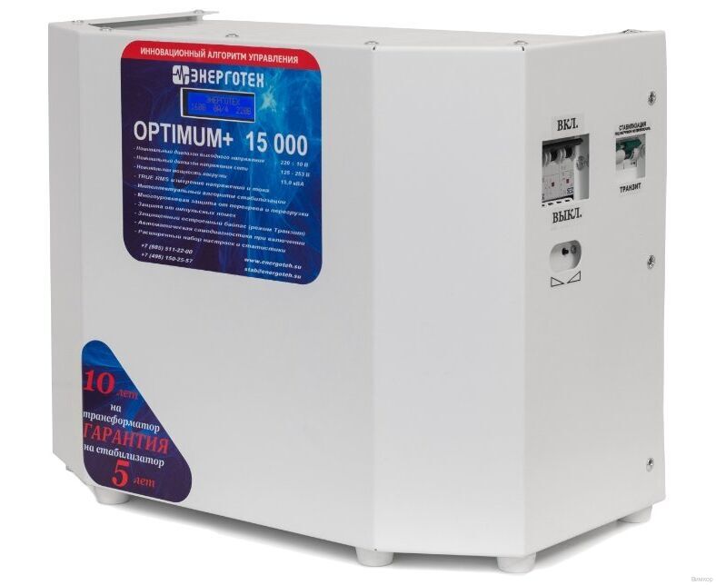 - Инженерная особенность: Однофазный стабилизатор Энерготех OPTIMUM+ 15000 HV автономен, не нуждается в обслуживании, не имеет реле, сервопривода и других механических деталей, подверженных износу.