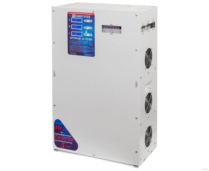 - Значимый факт: Трехфазный стабилизатор Энерготех OPTIMUM+ 15000х3 автономен, не нуждается в обслуживании, не имеет реле, сервопривода и других механических деталей, подверженных износу.