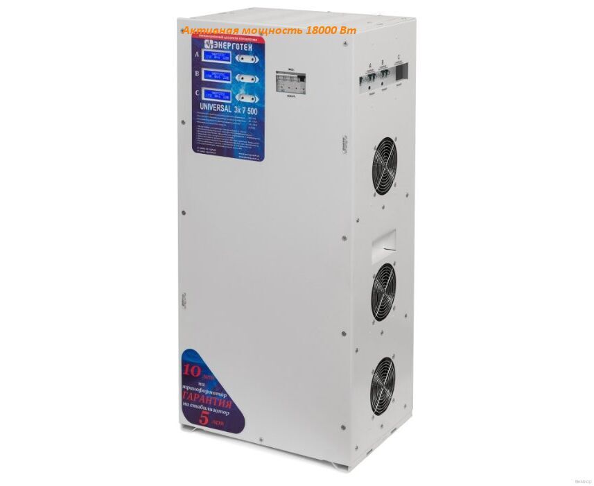 - Важное дополнение: Трехфазный стабилизатор Энерготех UNIVERSAL 7500x3 HV электронный на тиристорных ключах, полностью автономен и не нуждается в вашем контроле и обслуживании, не имеет реле, сервопривода и других механических деталей, подверженных износу.
