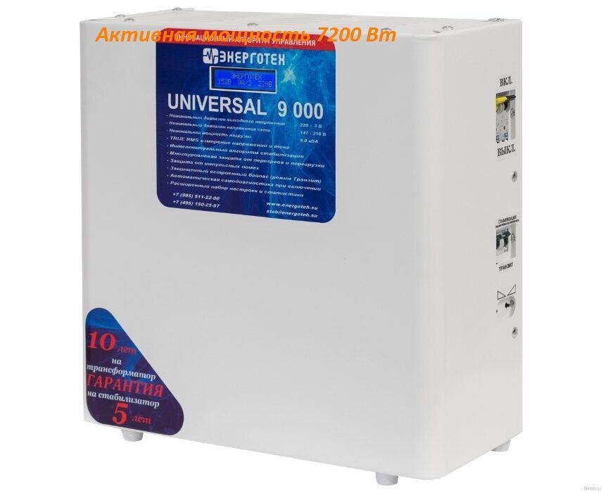 - Конструктивное исполнение: Стабилизатор UNIVERSAL 9000 HV разработан для подключения однофазных потребителей мощность которых не превышает 9000 ВА (7200 Вт) и точность стабилизации на выходе составляет ±1,5%.