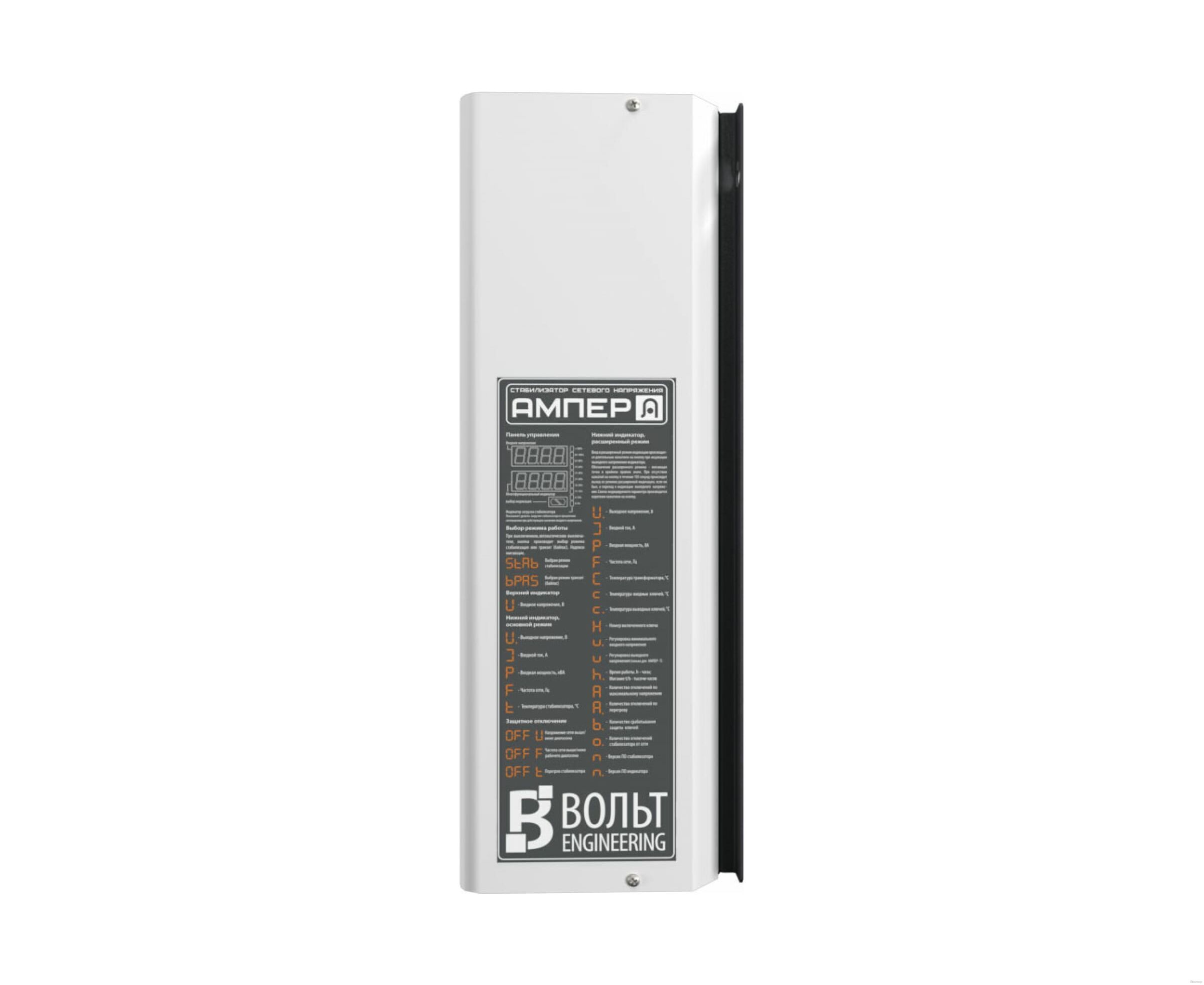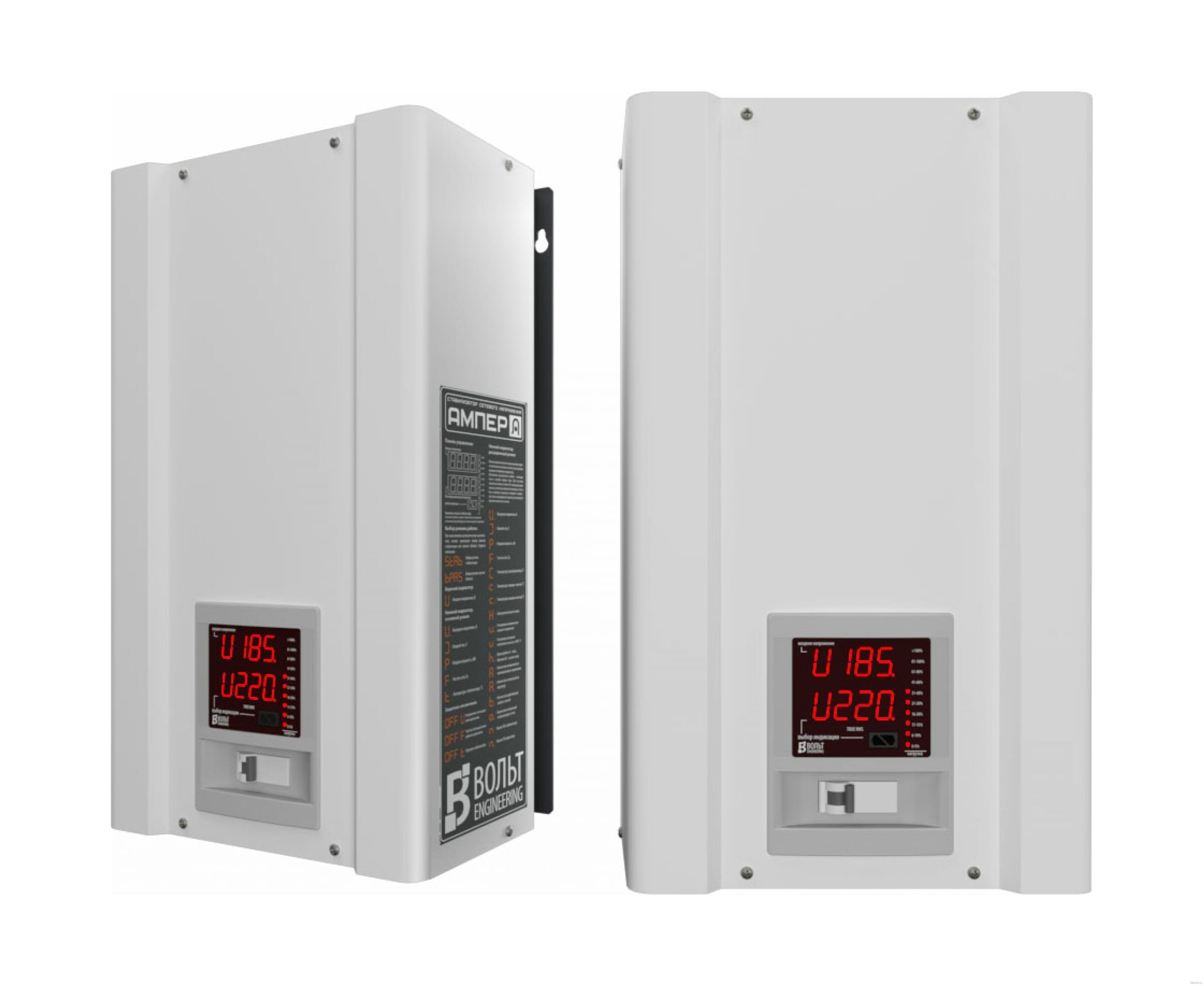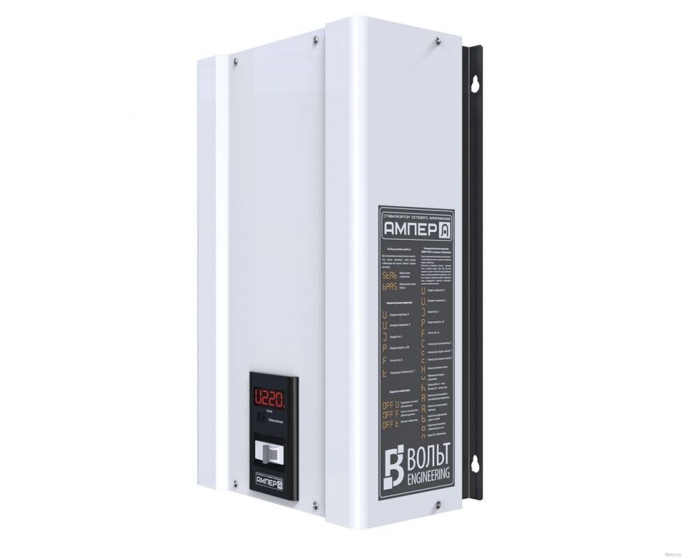 - Техническая спецификация: Стабилизаторов ВОЛЬТ Engineering серии Ампер: электронный байпас; бесшумный автотрансформатор; практически мгновенная реакция на изменения в электрической сети; высокая точность стабилизации; анализатор сети и true RMS-измерение; системы защиты от перегрузки, КЗ, от перегрева; металлический окрашенный корпус.